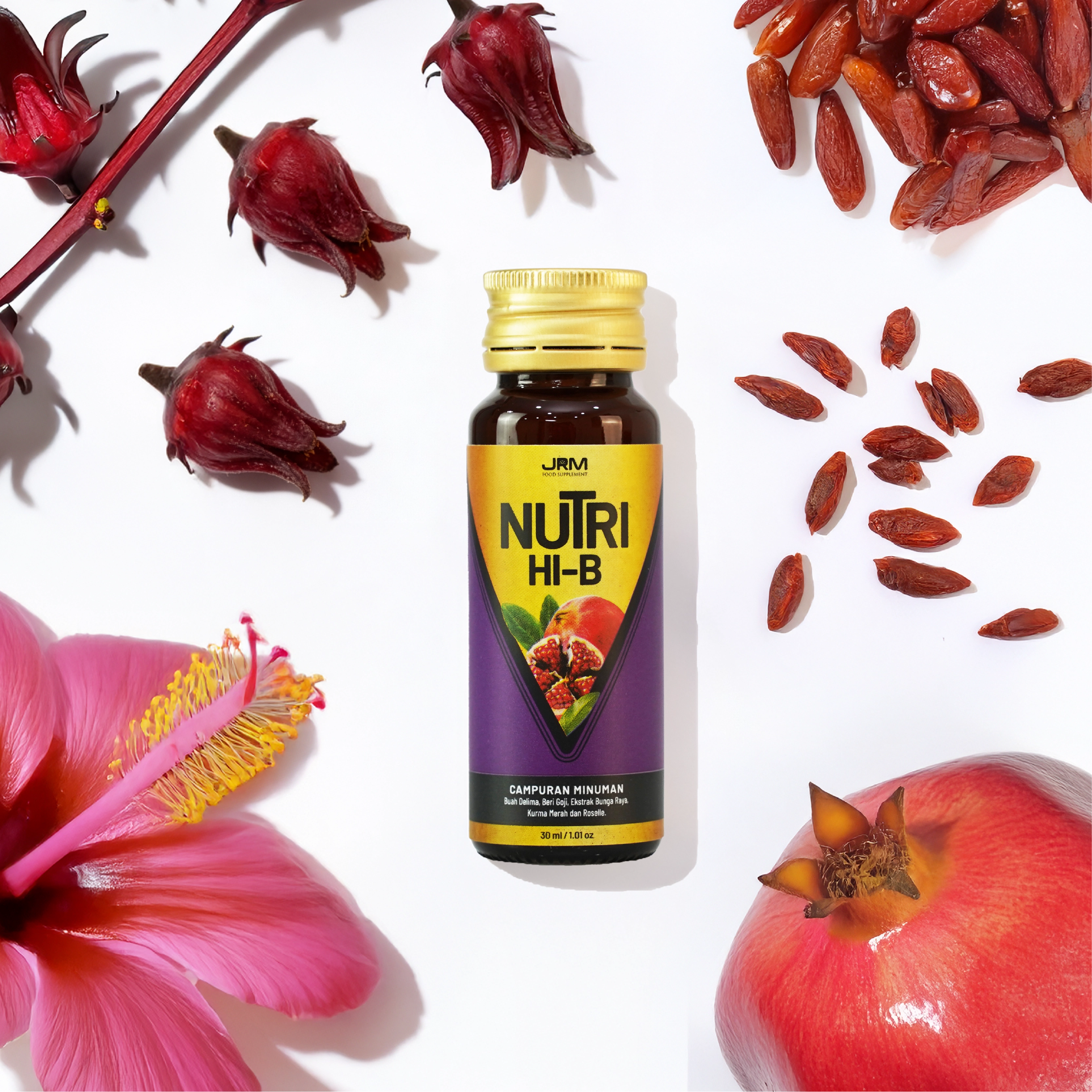 Campuran Minuman Buah Delima, Beri Goji, Ekstrak Bunga Raya, Kurma Merah dan Roselle.