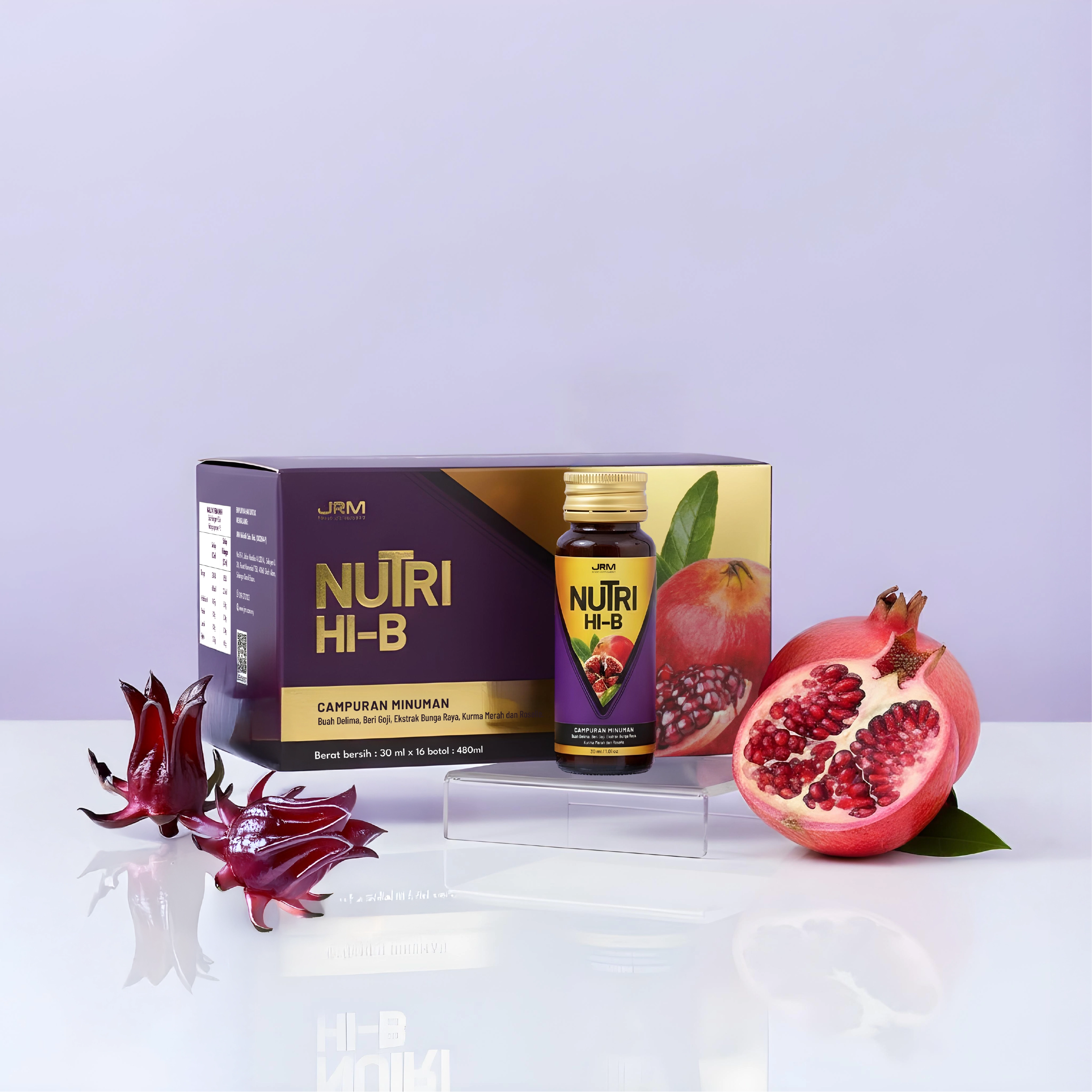 Campuran Minuman Buah Delima, Beri Goji, Ekstrak Bunga Raya, Kurma Merah dan Roselle.